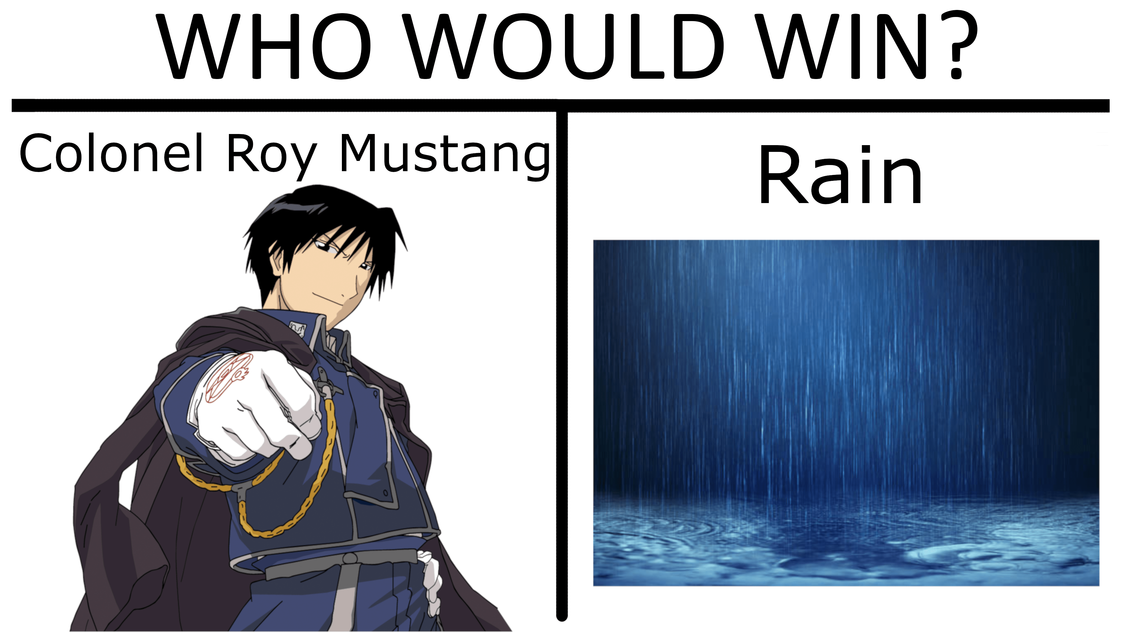 If you find this site serviceableness, please support us by sharing this posts to your preference social media accounts like Facebook, Instagram and so on or you can also Download this blog page with the title Roy Mustang Rain Meme by using Ctrl + D for gadgets a laptop with a Windows operating system or Command + D for laptops with an Apple operating system. If you use a smartphone, you can also use the drawer menu of the browser you are using. Whether it's a Windows, Mac, iOS or Android operating system, you will still be able to bookmark this site.